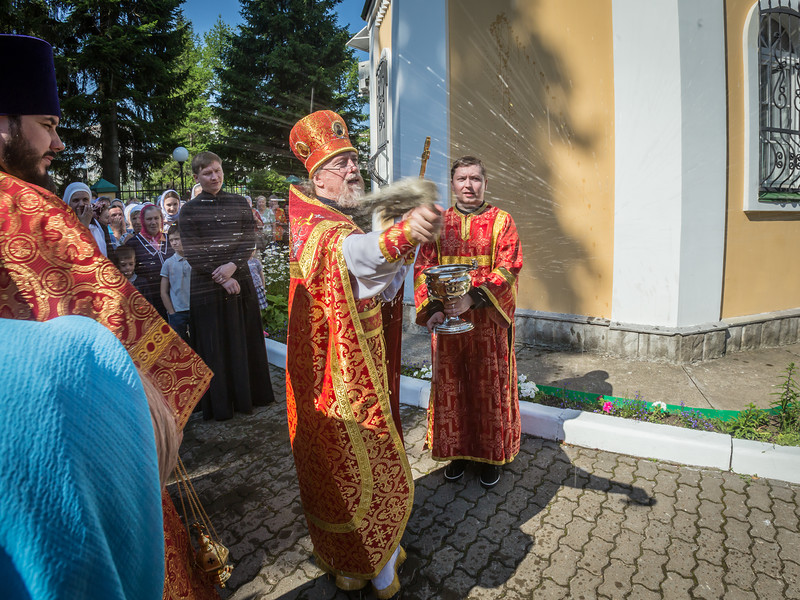 День освящения, 17 июля, выдался очень солнечным и жарким. (Все лето до этих дней шли дожди, и развелась большая сырость). У храма собралось много людей, многие не смогли попасть в храм, стояли на улице. Чин освящения совершал Архиепископ Ижевский и Удмуртский Николай в сослужении благочинного Ижевского округа архимандрита Матфия, митрофорного протоиерея Виктора Костенкова, протоиерея Сергия Кондакова и священника Александра Хлебникова.